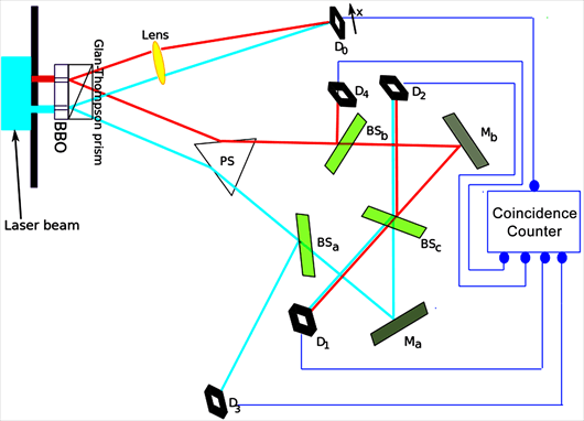 Bei dessen Versuchsaufbau werden verschränkte Photonenstrahlen hinter einem Doppelspalt durch verschiedene Strahlteiler (halbdurchlässige Spiegel) mit jeweils fünfzigprozentigen Wahrscheinlichkeiten in unterschiedliche Richtungen gelenkt und von verschiedenen Detektoren erfasst (siehe Bild). Je nachdem, wo die Detektoren platziert sind, kann entweder nur ein bestimmter Photonenstrahl einen Detektor erreichen (zum Beispiel bei den Detektoren D3 und D4) oder es können verschiedene mögliche Strahlen auf den Detektor treffen, wobei unklar bleibt, welcher das im Einzelfall ist (zum Beispiel bei D1 und D2). Immer dann, wenn diese Unklarheit vorliegt, zeigt sich beim Auslesen der betreffenden Detektoren ein Interferenzmuster. Verschwindet die Unklarheit, indem man bestimmte Strahlteiler entfernt, verschwindet auch das Interferenzmuster.