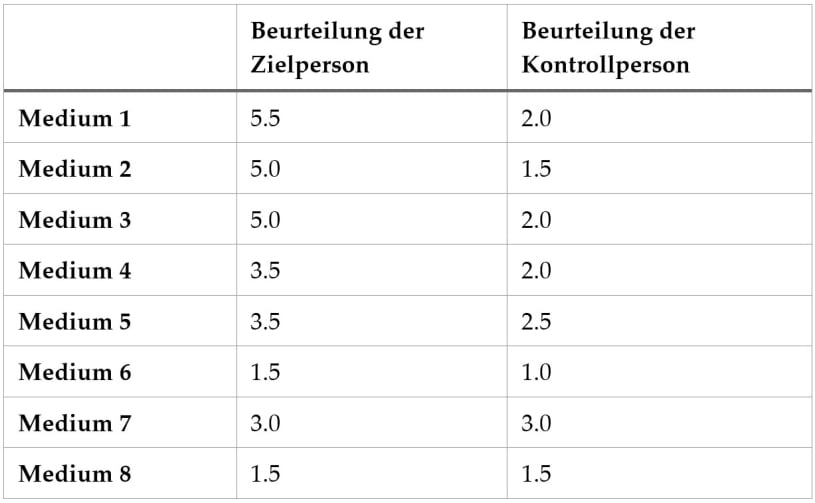 Allerdings könnte man vorab nicht sagen, bei welchem der beiden Verstorbenen aus einer Zweiergruppe dieser Wert dann auftauchen würde. Ob eventuelle Glückstreffer beim „richtigen“ Verstorbenen oder beim „fremden“ Verstorbenen erfolgen, wäre ja, wenn die Medien ohnehin nur raten, reiner Zufall. Sollten Jenseitskontakte hingegen echt sein und funktionieren, sollte man erwarten, dass die acht Hinterbliebenen aus den ihnen vorliegenden Beschreibungen stets diejenigen deutlich höher bewerten, die für ihre verstorbenen Angehörigen erstellt wurden. Man sollte dann auch erwarten dürfen, dass zumindest einige besonders treffende Beschreibungen dabei sind, die mit einer Vier, einer Fünf oder sogar höher bewertet werden.